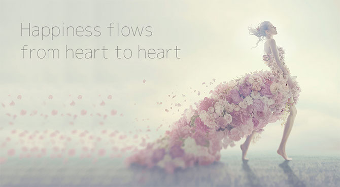 ············花はたった一輪で 可憐な美しさを放つ。 花と花 ⼈と花 空間と花 それぞれを響き合せたとき 新たなストーリーが生まれ 想像を超えた美しさを放つ。 花のある美しい世界を創造し 世界中の人々に喜びと感動を伝えよう。············